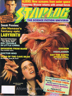 Jim Henson’s fantasy epic Labyrinth preview; Aliens: Sigourney Weaver; Tom Cruise: Legend to Top Gun; Big Trouble in Little China; Invaders from Mars; Doctor Who; Clan of the Cave Bear; Cocoon; Highlander; Day the Earth Stood Still: the almost sequel
