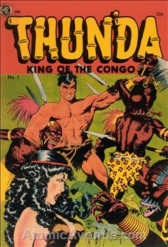 Thun’da was technically part of the series A-1 Comics, an anthology title with a different feature in each issue, but the six Thun’da issues are generally considered to be a standalone run of their own. Thun’da, King of the Congo, was a brazen Tarzan clone of the kind extremely pervasive on the comic stands during the 1940s and 1950s. He made a living contending with greedy ivory poachers and rescuing hapless maidens from the grip of unruly natives. Unremarkable stuff generally, except for the landmark first issue which bears the unique distinction of being the only comic book illustrated cover to end by the great fantasy artist Frank Frazetta. Through Frazetta’s masterful craftsmanship, the jungles teem with life and details; graceful human forms pour across the pages; eyes sunk in moody, shadow-lined faces convey depth far beyond the simplistic stories. Thun’da #1 was later reprinted as Thun’da Tales.