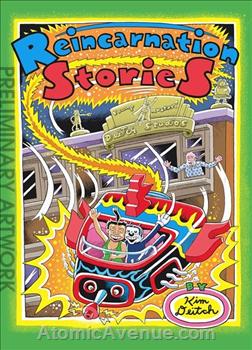 Sitting on a bench one day, four-year-old Kim Deitch is accosted by an elderly man. Flask in hand, the man exclaims, “Is it possible? Sid! SID PINCUS! Good God, man! You’ve changed!” A lightbulb goes off in the man’s head. “You died, Sidney! And now you live again!” Whisked away by his mother, young Deitch is left to wonder: Was it all just the mad ravings of a drunk or a tantalizing glimpse into reincarnation? Thus begins Deitch’s quest to piece together the cosmic jigsaw puzzle of creation and reveal his past lives. This sprawling odyssey weaves through time and space, encompassing a dizzying array of oddball characters, including aspiring screenwriter Sidney Pincus, a tribe of moon-dwelling Native Americans, a feline YouTube star, a has-been silver screen cowboy, Frank Sinatra, and the awesome Monkey God! Featuring Deitch’s surreal scenarios and eye-popping psychedelia, Reincarnation Stories is a gripping yarn and a cartooning tour de force.